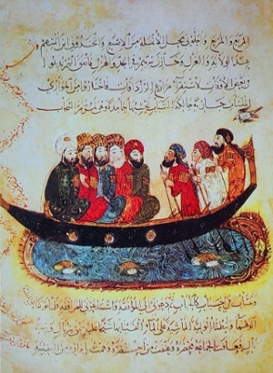 Arab traders exchanging stories on the boats to Bengal, 9th century